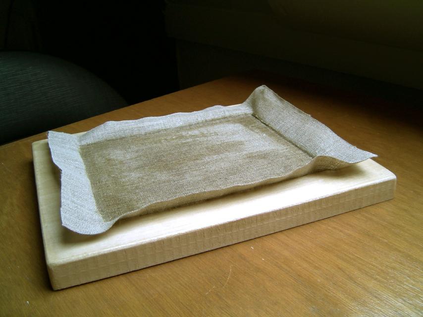 bestreken; daarna wordt het linnen opgebracht en goed aangedrukt, zodat zich