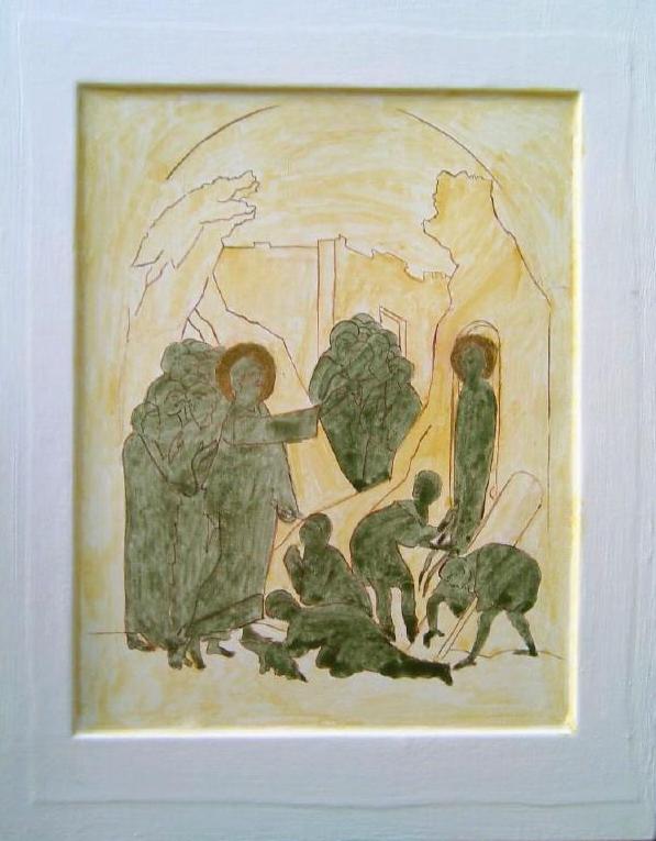 Gij hebt de menselijke natuur aangenomen, Als proplasmakleuren worden dikwijls gele oker en groene aarde gebruikt: oker voor de achtergrond, de rotsen, en de overige anorganische delen; groene aarde voor de levende natuur en de kleding. Handen, voeten en gelaat worden vervolgens met de donkerbruine gebrande siena gekleurd. Op de afbeelding hiernaast is alleen nog maar het geel en groen in lagen aangebracht. Ondanks het grote aantal lagen, dat al is aangebracht, is het groen nog steeds transparant; de tekening is nog slechts vaag zichtbaar.