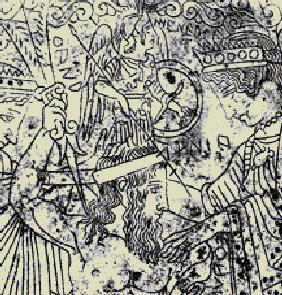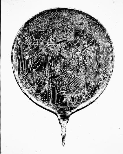 carries a shield on the left arm and holds a spear in the right hand. She is winged.